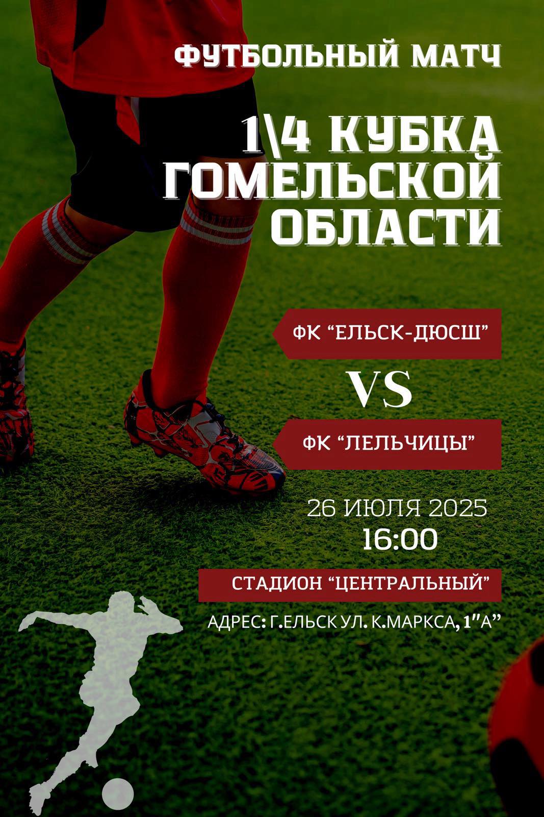 26.07.2025 - ⚽️Футбольный матч 1/4 Кубка Гомельской области по футболу среди мужских команд пройдет 26 июля 2025 года на стадионе "Центральный" г.Ельска. Встречаются команды ФК "Ельск-ДЮСШ" и ФК "Лельчицы". ⏱️Начало соревнований в 16.00