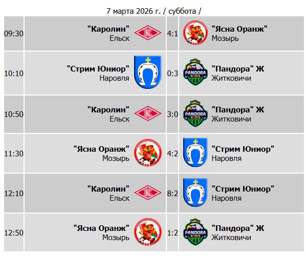"Каролин" Ельск обыграла команды: "Ясна Оранж" Мозырь со счетом 4:1, "Пандора " Ж Житковичи со счетом 3:0, "Стрим Юниор" Наровля со счетом 8:2.