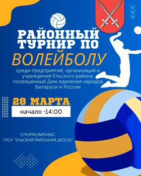 Районный турнир по волейболу в честь единения народов Беларуси и России состоится среди предприятий, организаций и учреждений Ельского района по адресу: г.Ельск, ул. Мозырский тракт, 15.